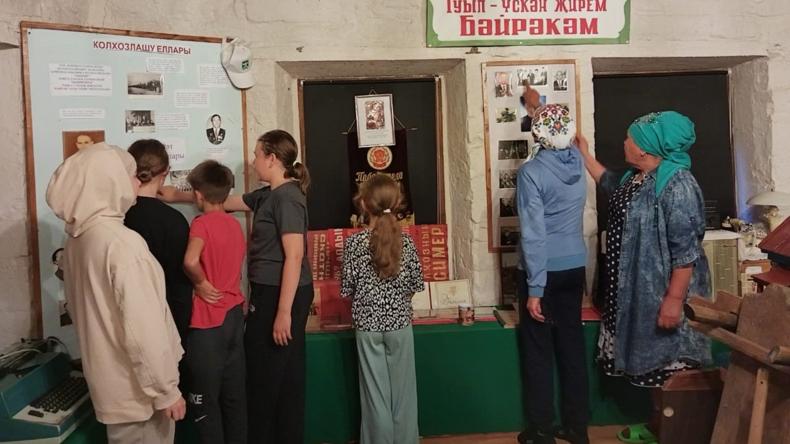 "Шушы жирдэн, шушы туфрактан без" . Председатель первичной организации Совета ветеранов (пенсионеров) села Хазеева Альфия Хакимовна рассказала ребятам об истории колхоза. Перед ребятами выступил Галиев Сирин Ахатович, более 40 лет возглавляющий хозяйство, депутат районного Совета, Почетный гражданин района.