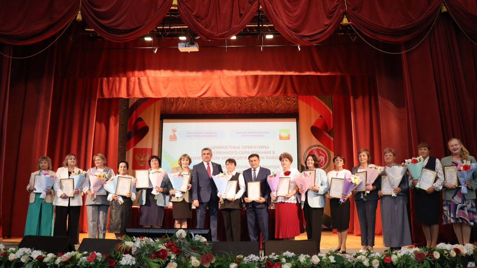 Министр образования и науки Татарстана участвовал в августовском совещании работников образования. В Нурлате прошло августовское совещание педагогических работников. В традиционном августовском совещании педагогов под началом главы Нурлатского района Дамира Ишкинеева принял участие министр образования и науки РТ Ильсур Хадиуллин. Совещание началось с государственных гимнов. Их исполнили воспитанники и педагоги детской школы искусств «Сәләт». После выступления школьников, участники мероприятия заслушали видеообращение министра просвещения Российской Федерации Сергея Кравцова. Участников конференции приветствовал глава района Дамир Ишкинеев. «В Нурлатском районе система образования является прочным фундаментом для развития всех направлений жизни. Благодаря вашему ответственному труду формируется будущее нашего района, молодому поколению дается возможность найти свой путь в жизни», – отметил он, обозначив, что в районе созданы все условия для всестороннего развития нурлатцев. Далее участников совещания поприветствовал министр образования и науки РТ. Ильсур Хадиуллин отметил высокую подготовку нурлатцев к мероприятию, обсудил насущные вопросы в системе образования, пожелал учителям, воспитателям успешного нового учебного года.В ходе же заседания заслушали обширную информацию начальника управления образования района Алсу Рахматуллиной «Ценностные ориентиры современного образования в Нурлатском муниципальном районе». По разным темам ее дополнили и другие докладчики. По традиции на августовском совещании чествовали ветеранов отрасли, руководителей и педагогов, а также учителей, чьи ученики получили 100 баллов, выпускников, набравших по 100 баллов, молодых педагогов. За особые заслуги в области образования и воспитания подрастающего поколения и многолетний добросовестный труд многие руководители и учителя удостоились звания «Почетный работник сферы образования Российской Федерации», нагрудного знака «За верность профессии», Почетной грамотой Министерства просвещения РФ, знака отличия «Отличник сферы образования и науки Республики Татарстан», нагрудного знака Минобразования РТ «За заслуги в образовании», знака отличия «Почетный наставник», нагрудных знаков «За сохранение и развитие языков, культур, традиций», «Молодой педагог», Почетной грамоты Федерации профсоюзов РТ. Здесь же дипломы и денежные сертификаты вручили победителям смотра-конкурса за лучшую подготовку образовательных организаций к новому учебному году. Завершилось совещание песней «Посвящение учителям» в исполнении ансамбля «Белиссимо» ДШИ «Сәләт».
