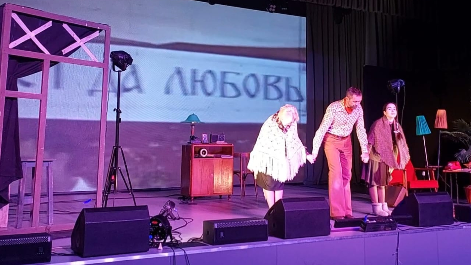 Параллельно на большом экране нам показывают фильм о мирной и счастливой жизни в СССР в 70-ые годы.