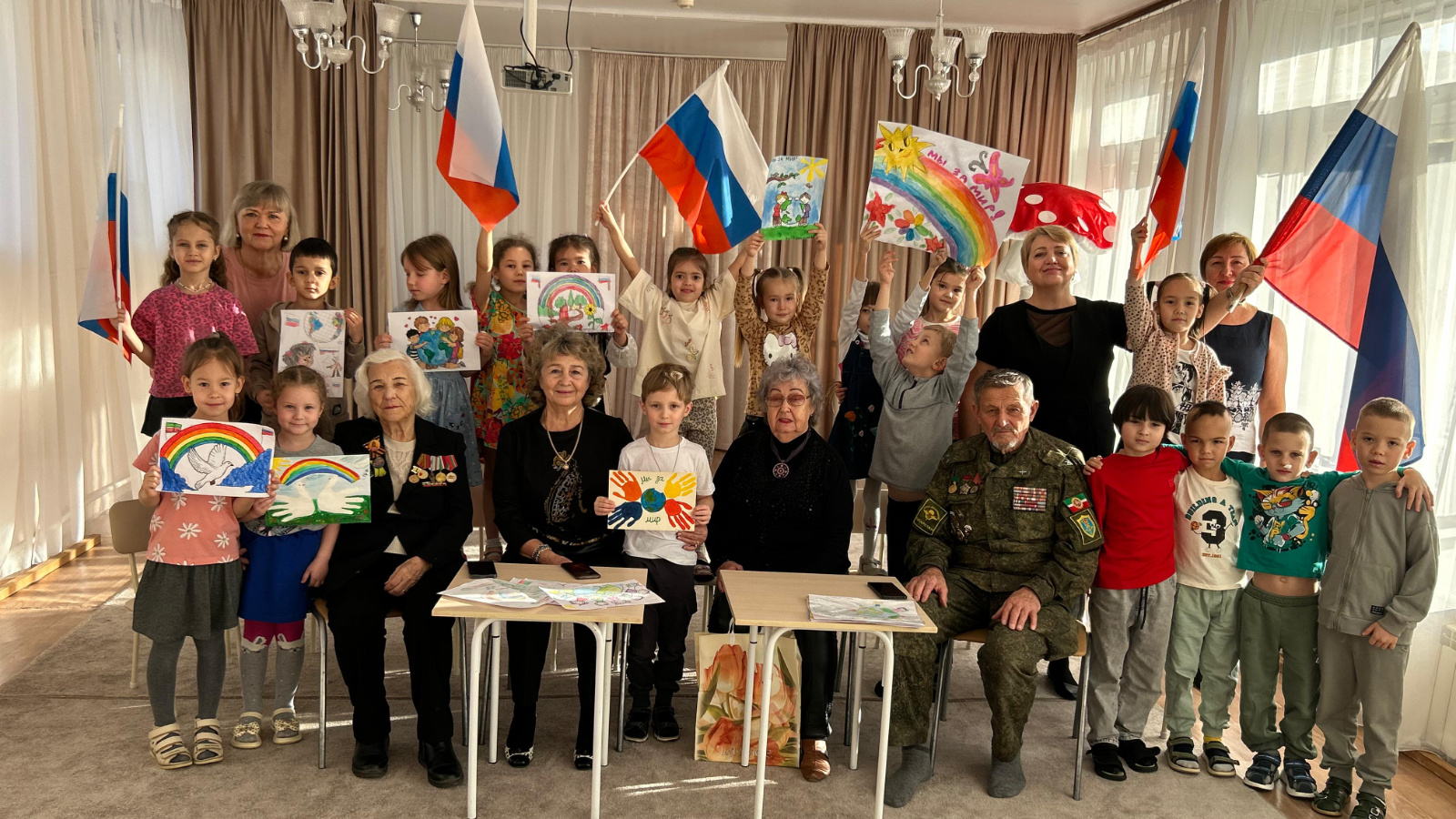 Дети с удовольствием и с пониманием отвечали на вопросы. В доступной форме о Героях, о Родине, Мире рассказали им пришедшие ветераны. К занятиям дети принесли свои рисунки, посвященные данной тематике. Эти рисунки решили передать нашим защитникам СВО.