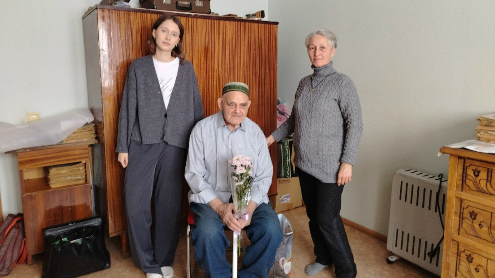 Совет ветеранов города Чистополь присоединились к поздравлениям юбиляра. От имени председателя Тихоновой Т.Н. Хамита Тахаутдиновича пришли поздравить зам.председателя Лазарева О.В. и секретарь Закирова И.Р., вместе со студентами Чистопольского филиала КИУ . Девушки из «Движения Первых» пообщались с именниником и взяли у него небольшое интервью. Хамит-абый интересный расказчик. Хорошо помнит начало войны и ратный труд на полях родного края в годы войны. С сыном своего друга общается и по сегодняшний день. Хамит – абый рассказал, что они шили одежду из мешков. Нарисовал выкройку на газете. Рассказал, что утеплялись они соломой, которую вкладывали между двумя штанинами. Рассказал, что переехав в 1947 году в Чистополь ездил в составе агитбригады по совхозам и колхозам в период уборки урожая, он был единственным гармонистом, игравшим татарские плясовые и песенные мелодии. Здоровья крепкого нашему юбиляру.